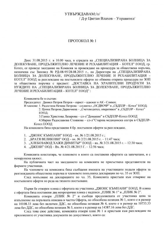 ПРОТОКОЛ №1 /31.08.2015г. от заседание на комисия за избор чрез процедура по ЗОП на доставчик на хранителни продукти по 5 обособени позиции